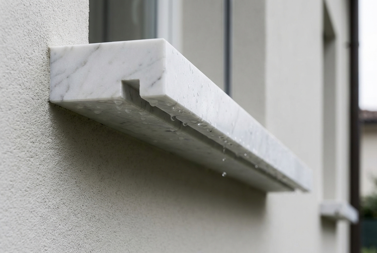 Il gocciolatoio è un’incisione realizzata nella parte inferiore del davanzale. La sua funzione è quella di interrompere il flusso dell’acqua piovana, impedendole di scorrere verso il muro sottostante.